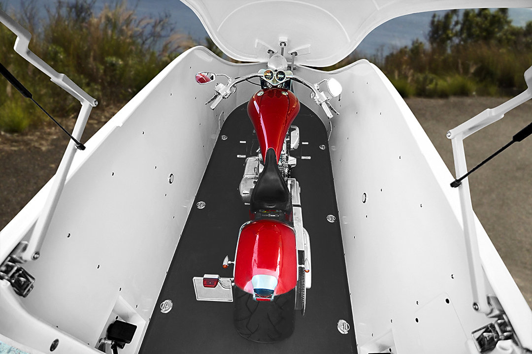 The opening roof allows you to conveniently store and secure the motorcycle in the trailer.