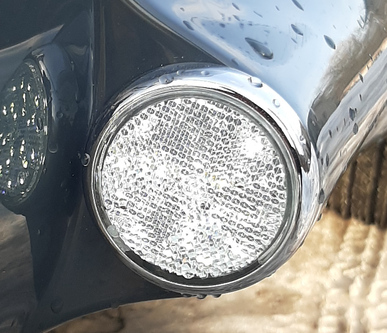 round shape with integrated reflectors, framed by a chrome edge and seamlessly integrated into the body, harmoniously "growing out".